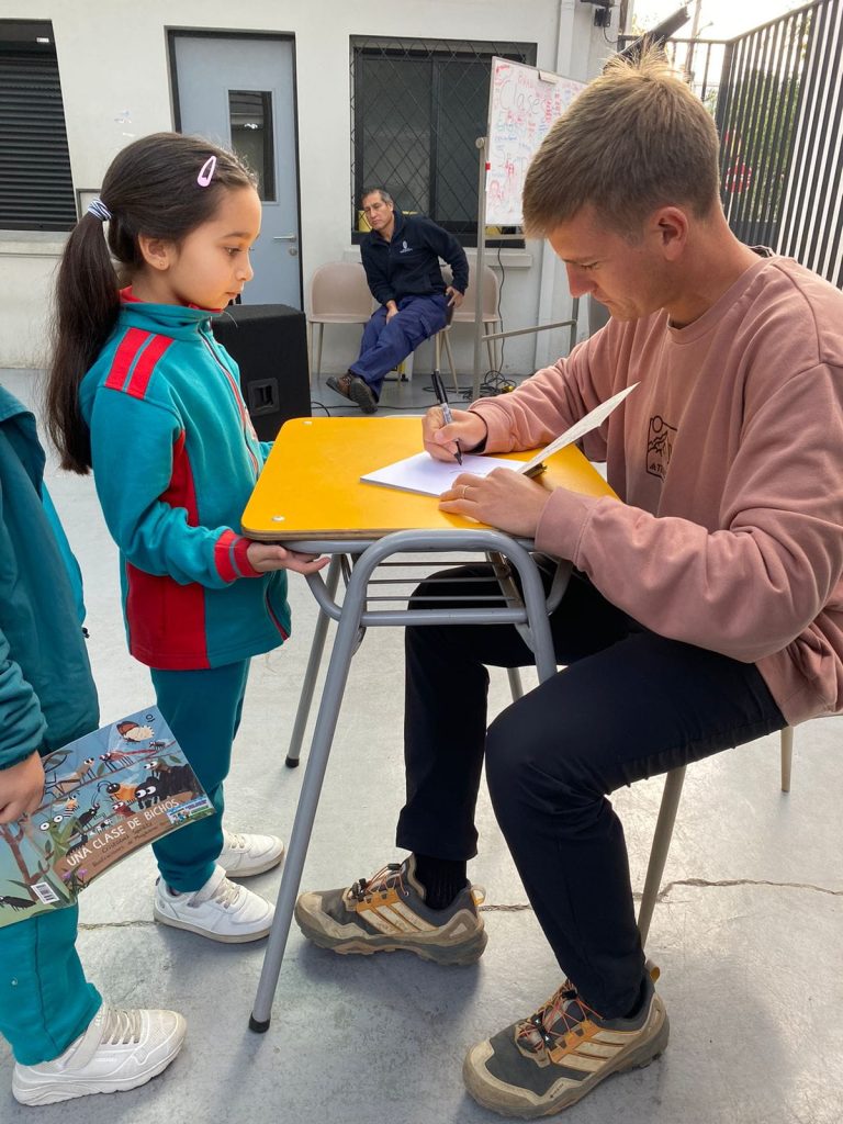 Durante la jornada, el escritor compartió con los estudiantes a propósito de su libro Una clase de Bichos, generando un espacio de aprendizaje y reflexión en torno al fascinante mundo de los insectos. A través de su relato, los niños y niñas no solo disfrutaron de la lectura, sino que también profundizaron en la importancia de estos seres vivos en la naturaleza, sus características y el valor de cada organismo dentro del ecosistema.
